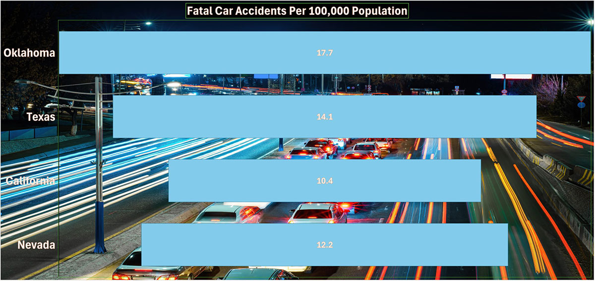 A recent study conducted by the University of Pennsylvania revealed that fatal accidents are far more common in rural areas than in dense cities. The study shows that fewer roads and slower traffic speeds prevent drivers from having a fatal collision. While accidents are more frequent in major cities like Oklahoma City, fatal accidents are rarer due to having fewer high-speed roadways. However, since the state of Oklahoma has far more high-speed roads than most other places, you can see in the graph below how their fatal accidents per 100,000 citizens are much higher than other states.