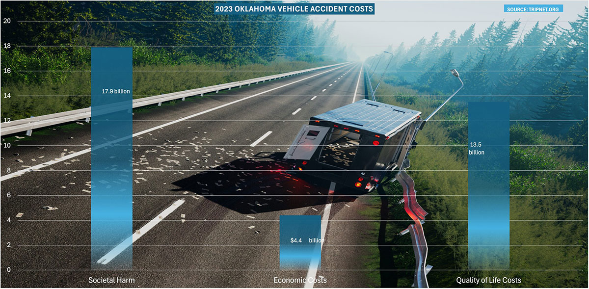 Truck accidents are among the most dangerous types of accidents on the road, leaving many with long-term or permanent injuries. Oftentimes, these accidents are so catastrophic that they impact more than just the victims, causing whole communities to suffer. In economic terms, truck accidents can harm local businesses, traffic routes, and supply chains, which can lead to long-term economic decline, depending on how major the trucking accident was. The graph below shows the economic blow suffered by the state of Oklahoma due to trucking accidents in 2023.